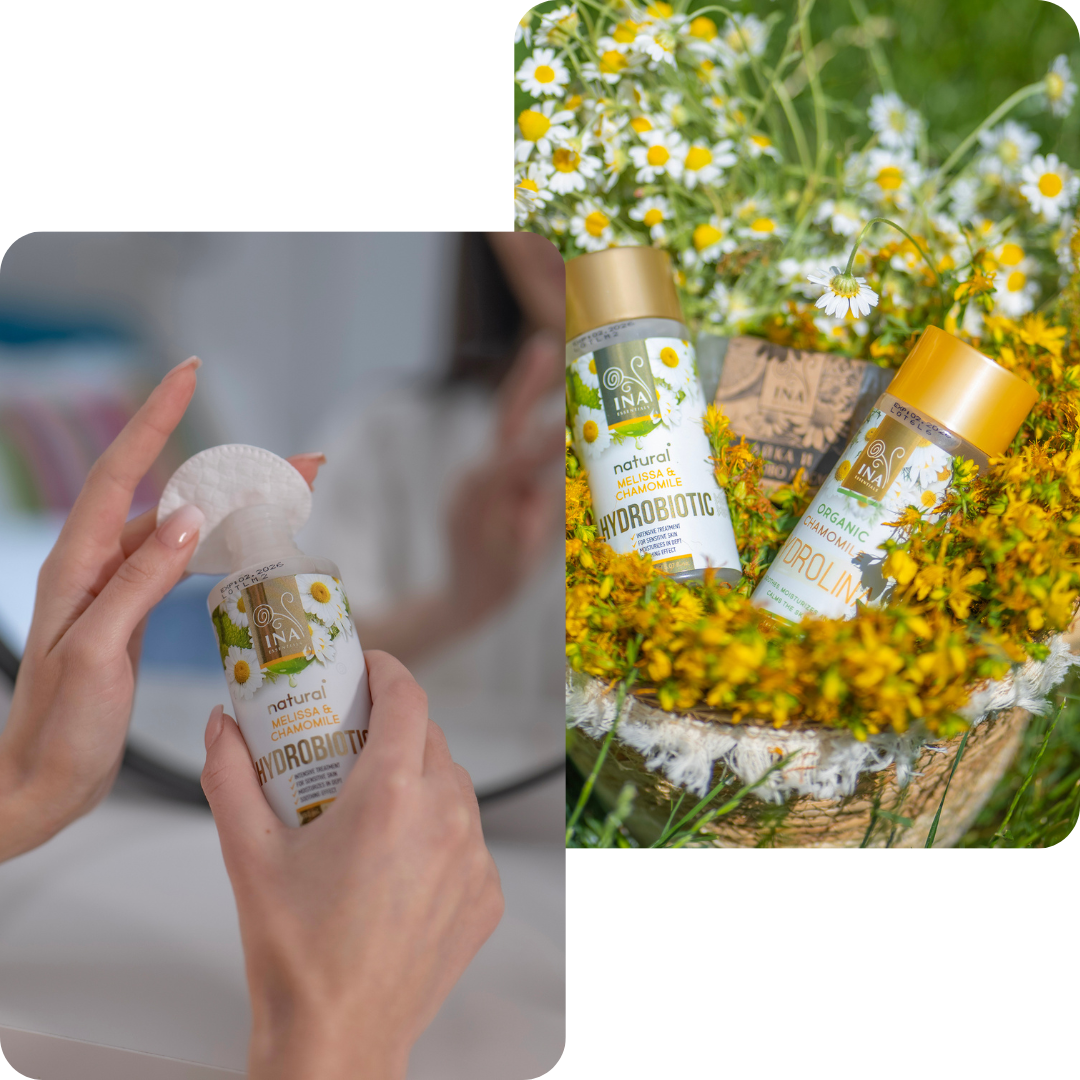 Transformeer je huid Biologisch Kamillewater Hydrolina, ons door de familie gemaakte antwoord tegen eczeem en geïrriteerde huid met kalmerende en regeneratieve effecten. De perfecte keuze voor normale, gecombineerde, droge en gevoelige huid.