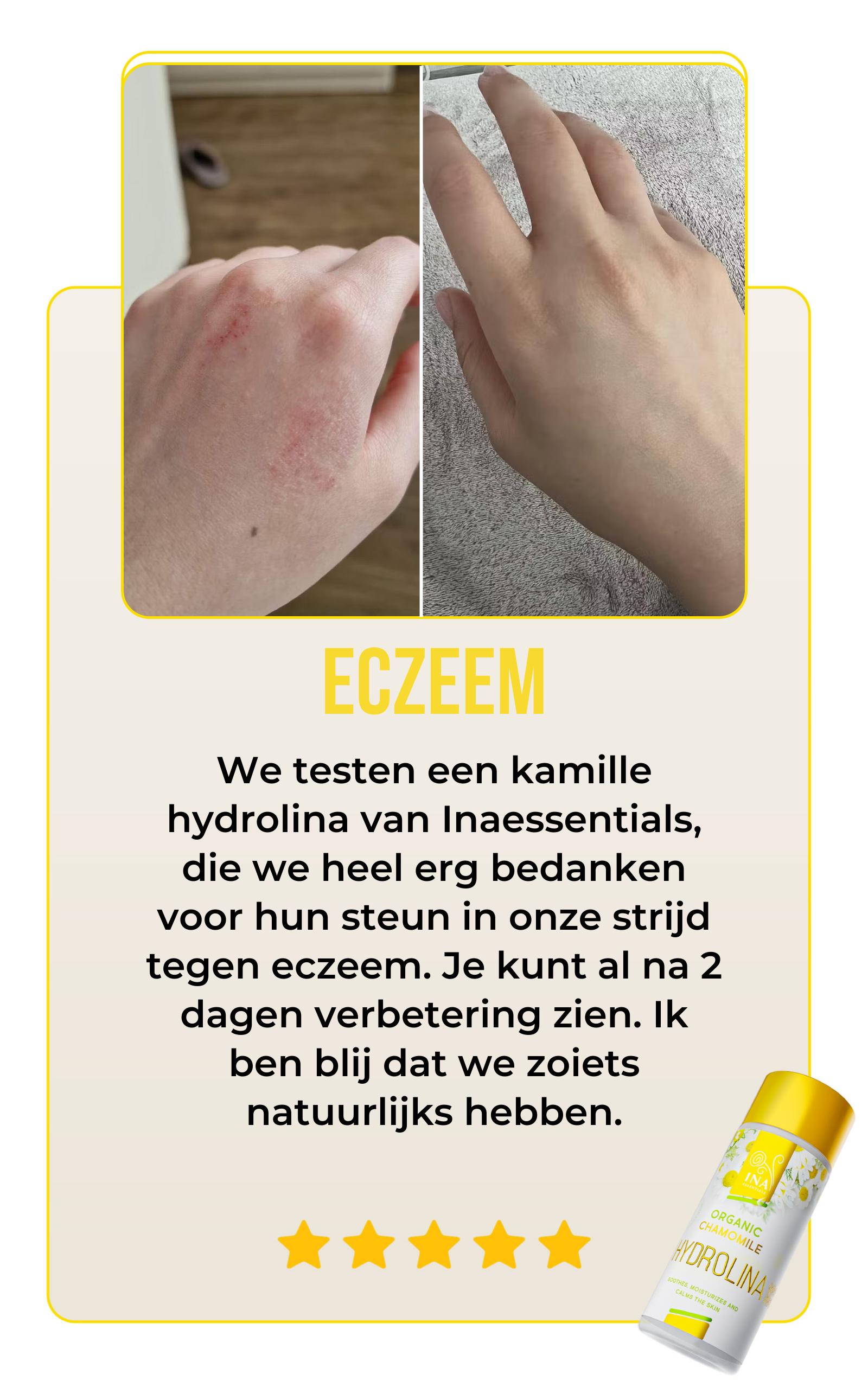Op mijn gezicht heb ik een lichte vorm van Eczeem en Rosacea. Ik gebruik de Kamillewater nu bijna twee weken en mijn huid is zichtbaar rustiger geworden. Het is alsof er langzaam aan een nieuwe laag gezonde huid ontstaat.