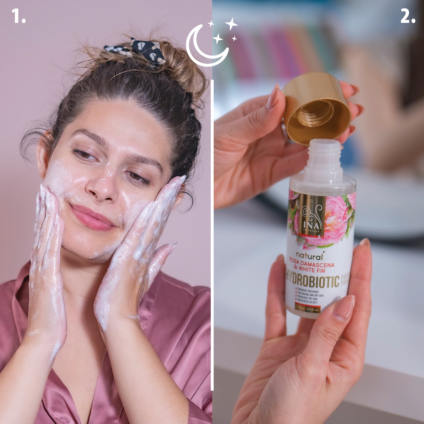 - Stap 1: Begin in de ochtend met het wassen van uw gezicht met onze Biologische Roos Damascena Olie en Geranium Kruidenzeep om onzuiverheden te verwijderen die de huid 's nachts heeft afgestoten en om de huid te hydrateren.