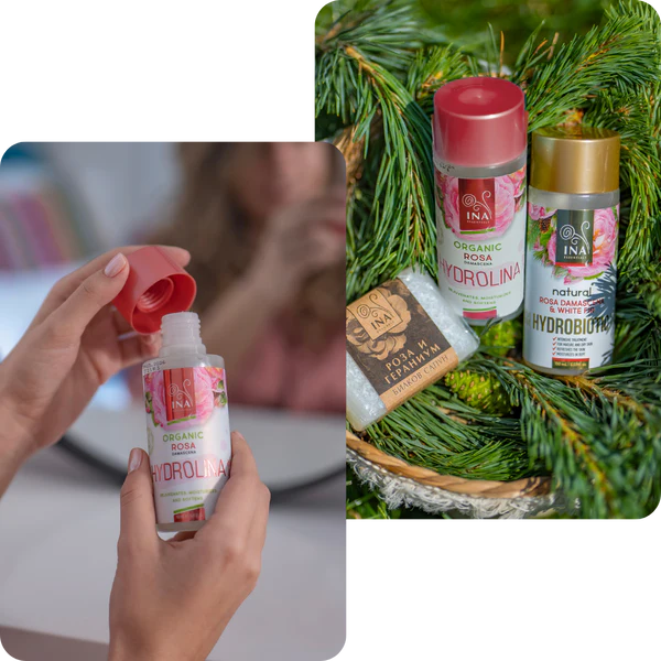 Combineert de hydraterende kracht van Glycerine en Kokosolie voor diepe hydratatie en huidherstel. Verrijkt met Roos Damascena en Geranium Olie, revitaliseert en kalmeert het de huid, terwijl Olijfolie voeding biedt. - Biologisch Rozenwater - Hydrolina: