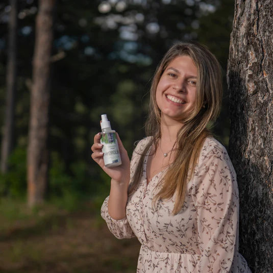 "Dit hydrolaat wordt liefdevol gemaakt met met de hand geplukte biologische Witte Den uit onze familiebossen."