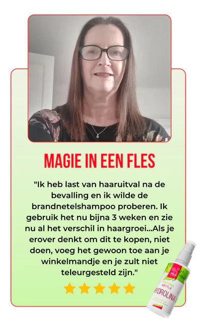 Wild Brandnetelwater - Hydrolina (150 ml) is meer dan alleen een prachtige fles, het wordt versterkt door echte klantgetuigenissen. Met een indrukwekkende klanttevredenheidsscore van meer dan 90% toont ons product zijn kracht in het aanpakken van haarverlies en vet haar, terwijl het tegelijkertijd de algehele gezondheid van je haar verbetert. Neem niet alleen ons woord ervoor, lees de verhalen van onze klanten.