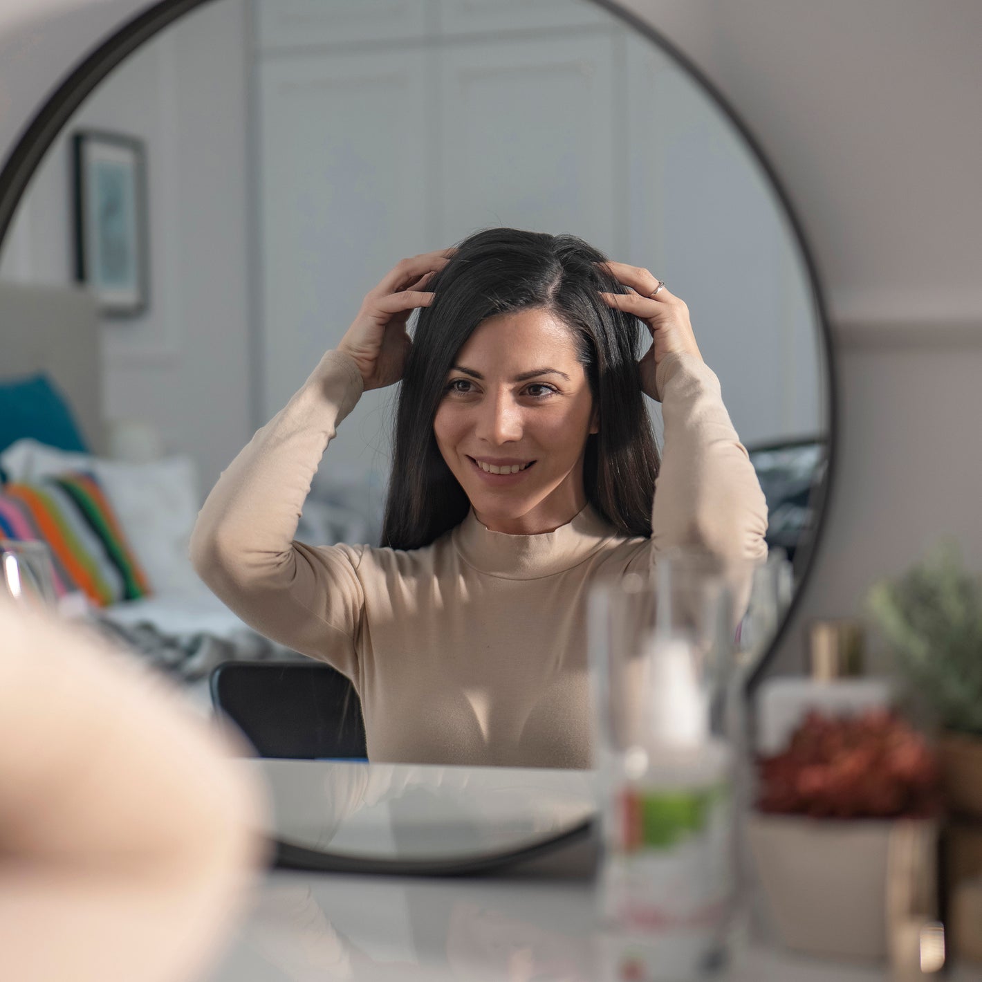 Spray in de haarwortels en masseer de hoofdhuid met zachte bewegingen.