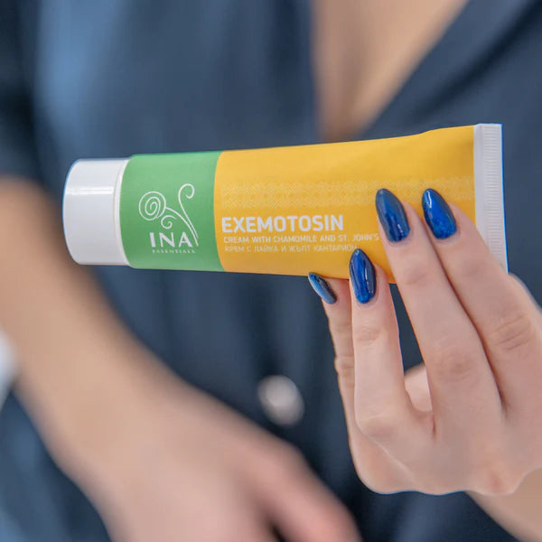 1. Exemotosin van InaEssentials is een hoogwaardige, zachte, voedende crème zonder parfum met natuurlijke actieve ingrediënten. Het is speciaal samengesteld om te voldoen aan de behoeften van de droge, schilferige, jeukende en rode huid, inclusief huidaandoeningen zoals psoriasis en eczeem.