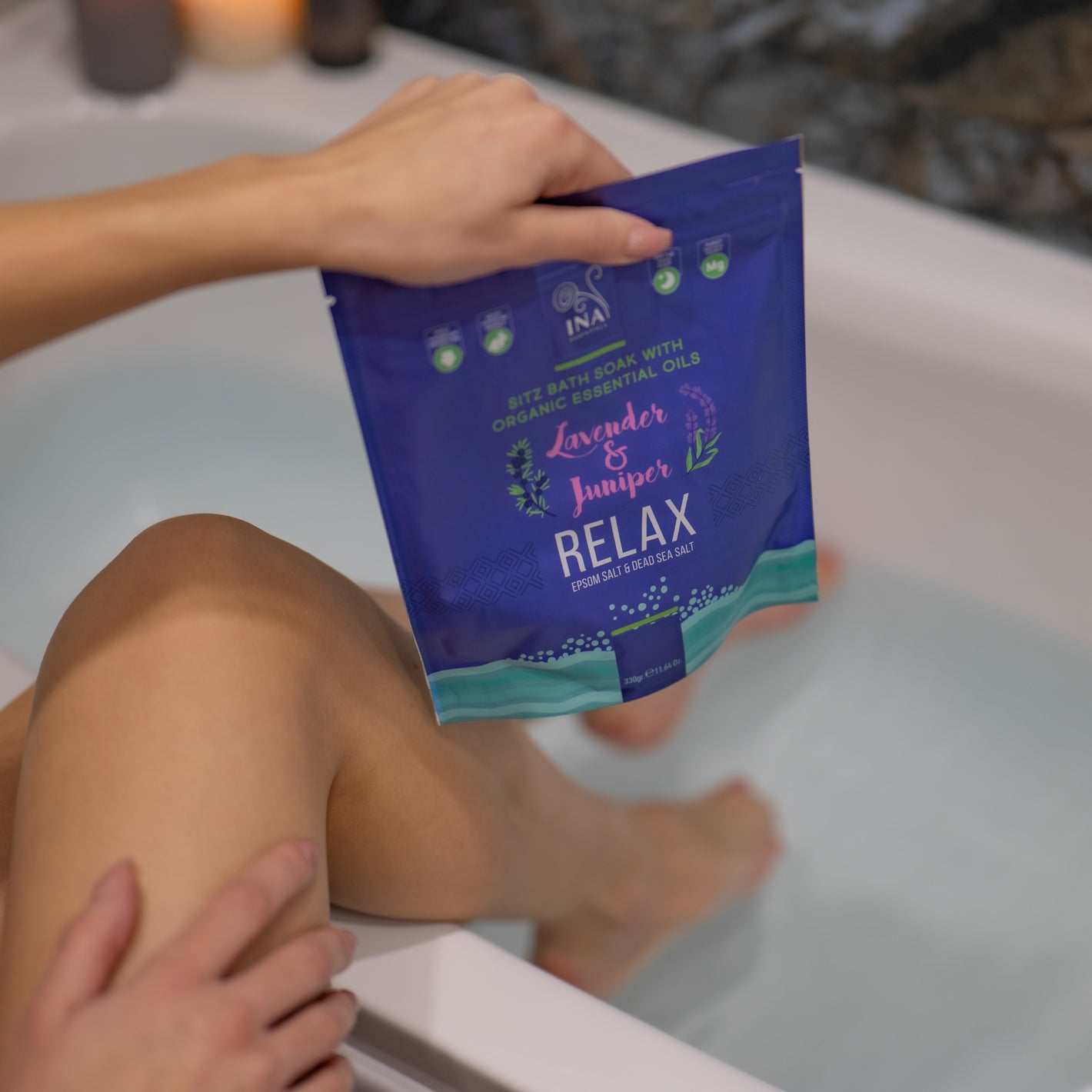 De natuurlijke formule van Epsom-zout en Dode Zee-zouten, in combinatie met Biologische Jeneverbes- en Lavendelolie, is een natuurlijke manier om het lichaam te ontspannen en stress te verlichten.