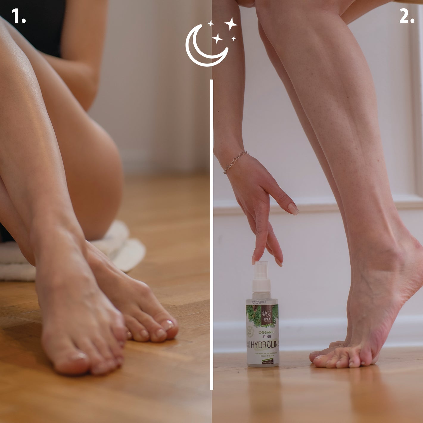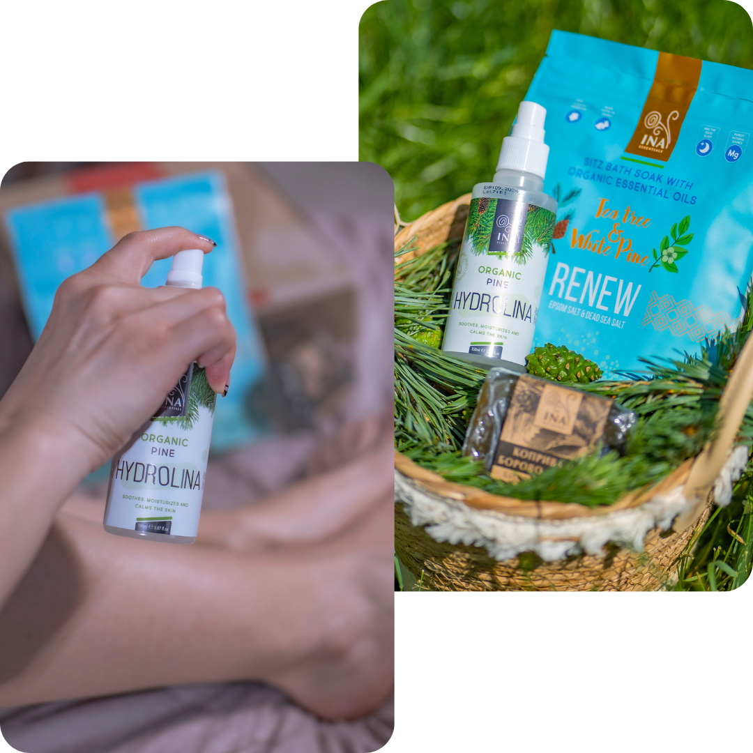 Stap 1: Spray onze 100% biologische Witte Den Water - Hydrolina. De antischimmel eigenschappen van het dennenwater stoppen de groei van schimmel, elimineert het onaangename geur en leggen een beschermend schild tegen dagelijkse irriterende stoffen. Het is ideaal voor dagelijks gebruik, vooral voordat je in schoenen of hakken stapt die je voeten kunnen laten zweten. Het minimaliseert de kans op voetwrijving en biedt een verfrissende, verkoelende sensatie.