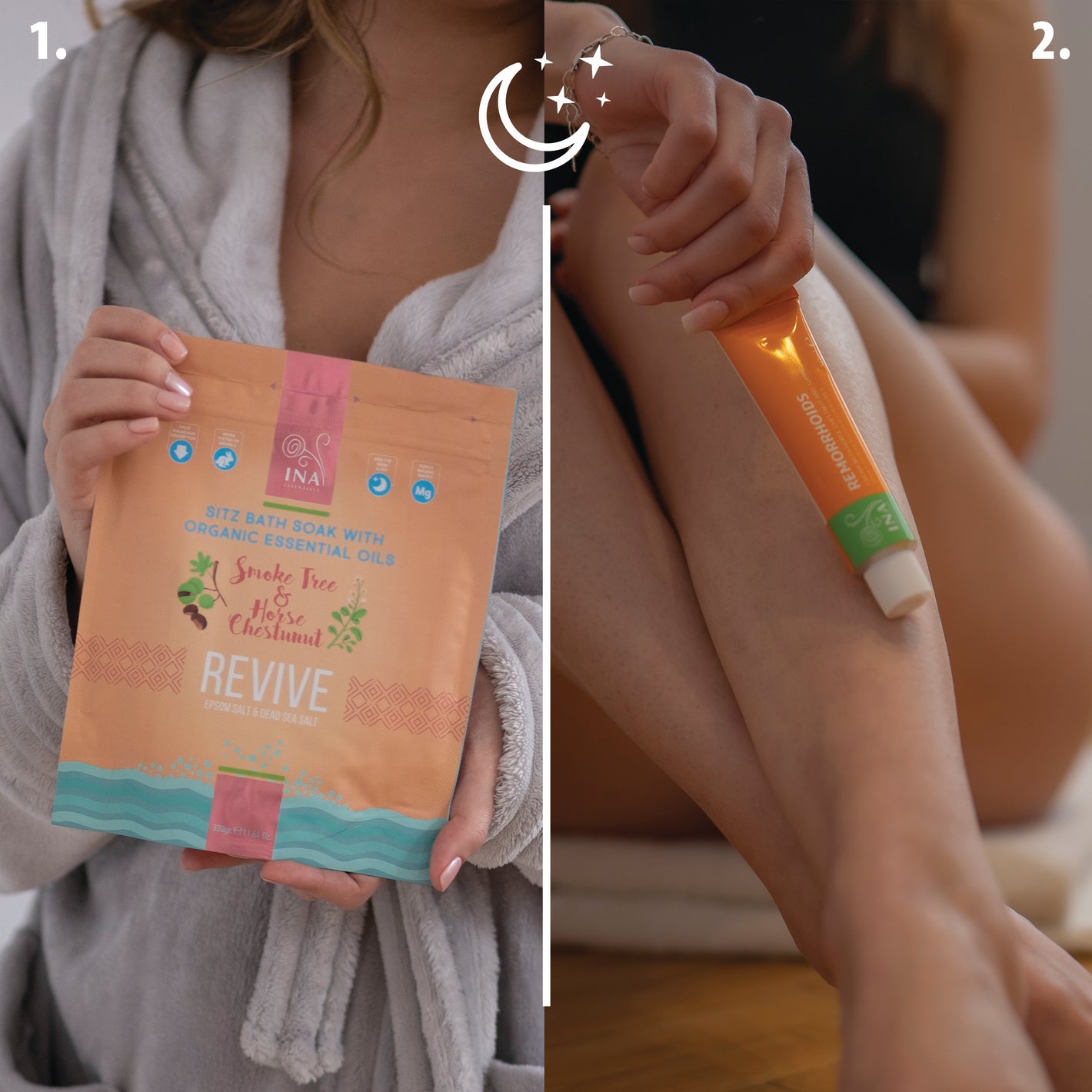 - Stap 1: 1-3 keer per week gun jezelf een ontspannend bad met onze Revive Sitz Bath Salts met rookboom en paardenkastanje. Deze zouten, verrijkt met paardenkastanje-extract en rookboomolie, verminderen het gevoel van zwaarte en vermoeidheid in je benen, verminderen stress en bevorderen de regeneratie van de huid. Het magnesium in de zouten stimuleert de huidregeneratie, wat zorgt voor snellere verlichting van de aangetaste gebieden.